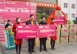 3月7日,公益系列活動(dòng)之“春暖2008,希望工程”愛(ài)心捐助儀式在山西現(xiàn)代女子醫(yī)院隆重舉行。捐助儀式上,山西現(xiàn)代女子醫(yī)院總經(jīng)理傅東軍代表醫(yī)院向山西省希望小學(xué)的貧困學(xué)生們捐贈(zèng)了10臺(tái)電腦。同時(shí),在“三八”婦女節(jié)到來(lái)之際,還向長(zhǎng)期支教希望小學(xué)的女教師們贈(zèng)送了價(jià)值4萬(wàn)元的愛(ài)心體檢卡,以表達(dá)對(duì)希望小學(xué)女教師們辛勤工作的回報(bào)。