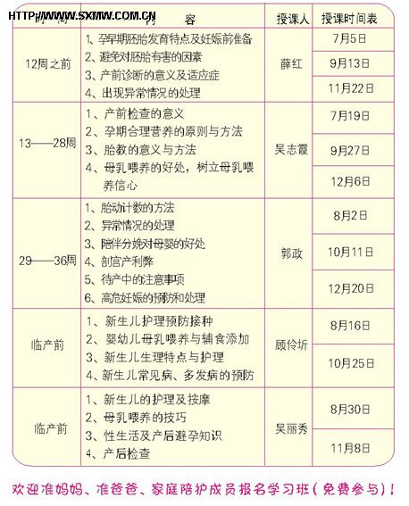現(xiàn)在,專為準(zhǔn)爸爸、準(zhǔn)媽媽們開設(shè)的“媽媽班”就要開課了。省內(nèi)部分知名醫(yī)生 將在課堂上對(duì)“優(yōu)生、優(yōu)育、優(yōu)教”的相關(guān)知識(shí)進(jìn)行精彩講解,并為大家提供健康指導(dǎo)和技術(shù)支持。“媽媽班”將帶領(lǐng)孕產(chǎn)婦在孕早期就開始進(jìn)行全面的保育、保健,并幫助孕產(chǎn)婦順利渡過圍產(chǎn)期。
